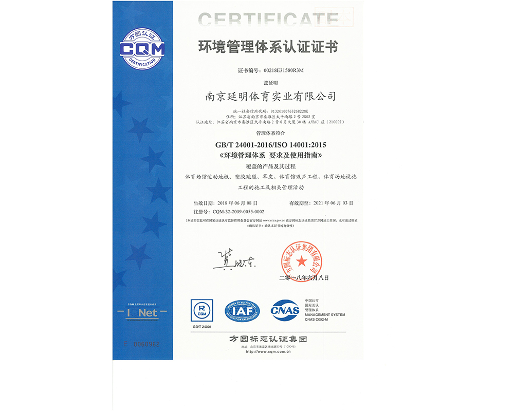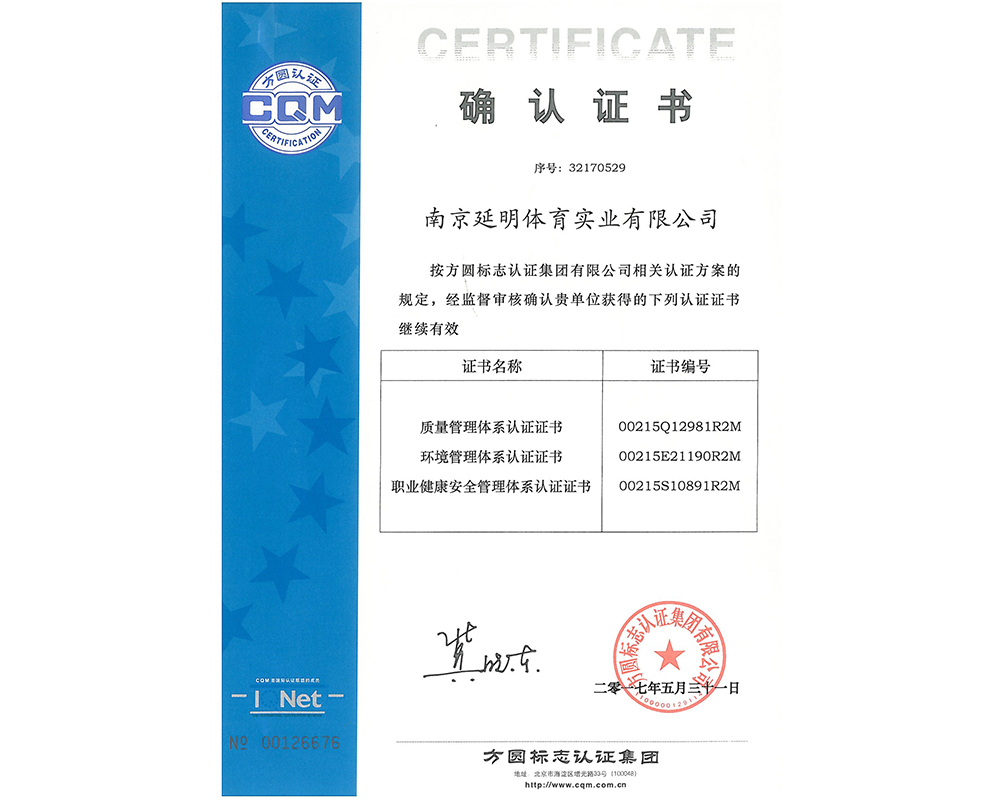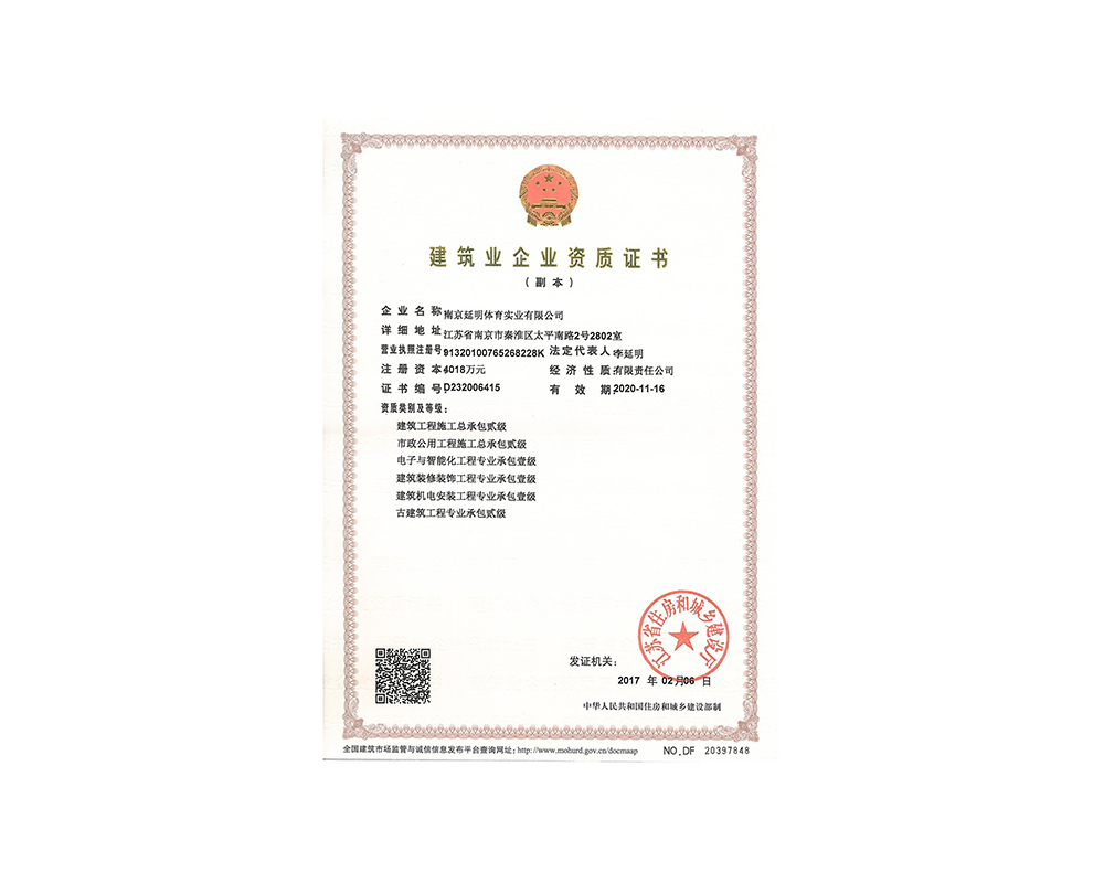 作為江蘇省體育產(chǎn)業(yè)示范單位,延明體育擁有多年相關(guān)工程總承包施工經(jīng)驗(yàn),取得建筑工程施工總承包二級(jí)、古建筑工程專業(yè)承包二級(jí)、建筑裝修裝飾工程專業(yè)承包一級(jí)、電子與智能化工程專業(yè)承包一級(jí)、市政公用工程施工總承包二級(jí)資質(zhì);通過ISO 9001:2015質(zhì)量管理體系認(rèn)證;通過ISO14001:2015環(huán)境管理體系認(rèn)證;通過IOS45001:2018職業(yè)健康安全管理體系認(rèn)證。